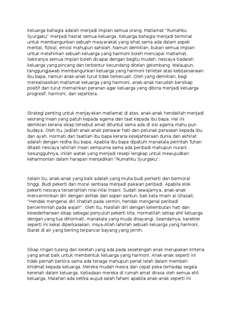 Bahagia keluarga yang bahagia karangan. Tingkatan 4 dan 5. Rumahku syurgaku merupakan ungkapan keramat yang memanifestasikan peri pentingnya setiap ahli dalam sesebuah keluarga memainkan peranan masing-masing dengan sebaik mungkin sehingga menjelmakan kebahagiaan yang menjadikan rumah seumpama syurga.